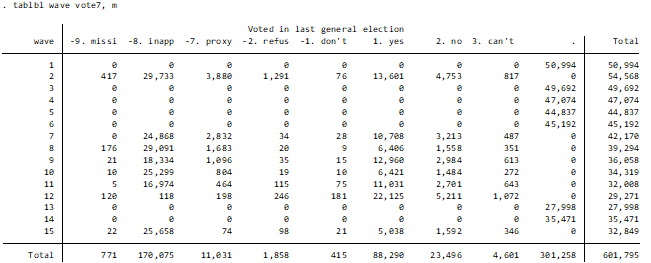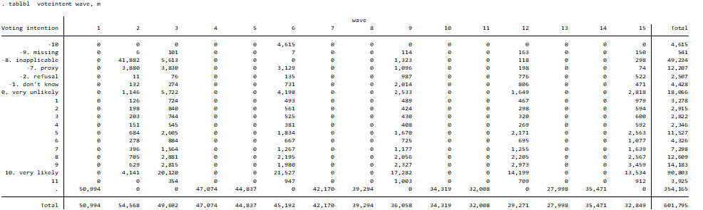 I am coming back to a dissertation I wrote a few years ago in the hope to rewrite it for publication in a journal. It utilised some political variables from the UKHLS such as voteintent (voting intention) and vote7 (voter turnout).