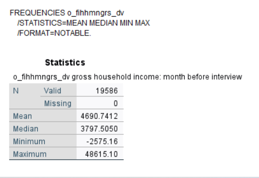 Here is the output and syntax I wrote, I've made sure no weights are included and no cases are intentionally excluded. I am looking at this variable from the Wave 15 household respondent datafile 'o_hhresp.sav'.