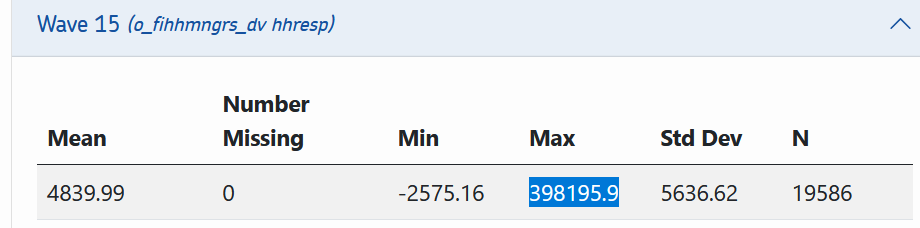I am looking at wave 15, doing an output for the mean, median, minimum and maximum I found that the mean is lower than on the website due to a discrepancy between the maximum amount a respondent gave on the dataset and website.