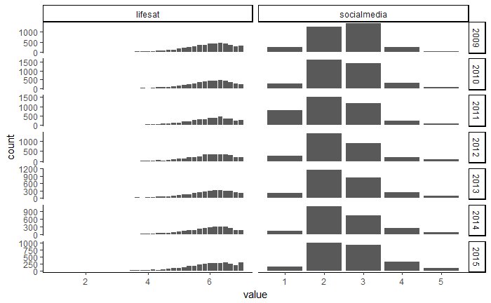 I am analysing the US youth self-completion questionnaire for waves 1-7. I have been plotting the histograms for distributions of NETCHT each year. There seems to be a spike in youth reporting they use no social media (option 1) in 2011. Normally there are ~200 respondents choosing 1, but in 2011 there are ~700. There seems to have been no change in the question, or phrasing, so I am not sure why this is occurring. I can provide my R code if that is helpful.
